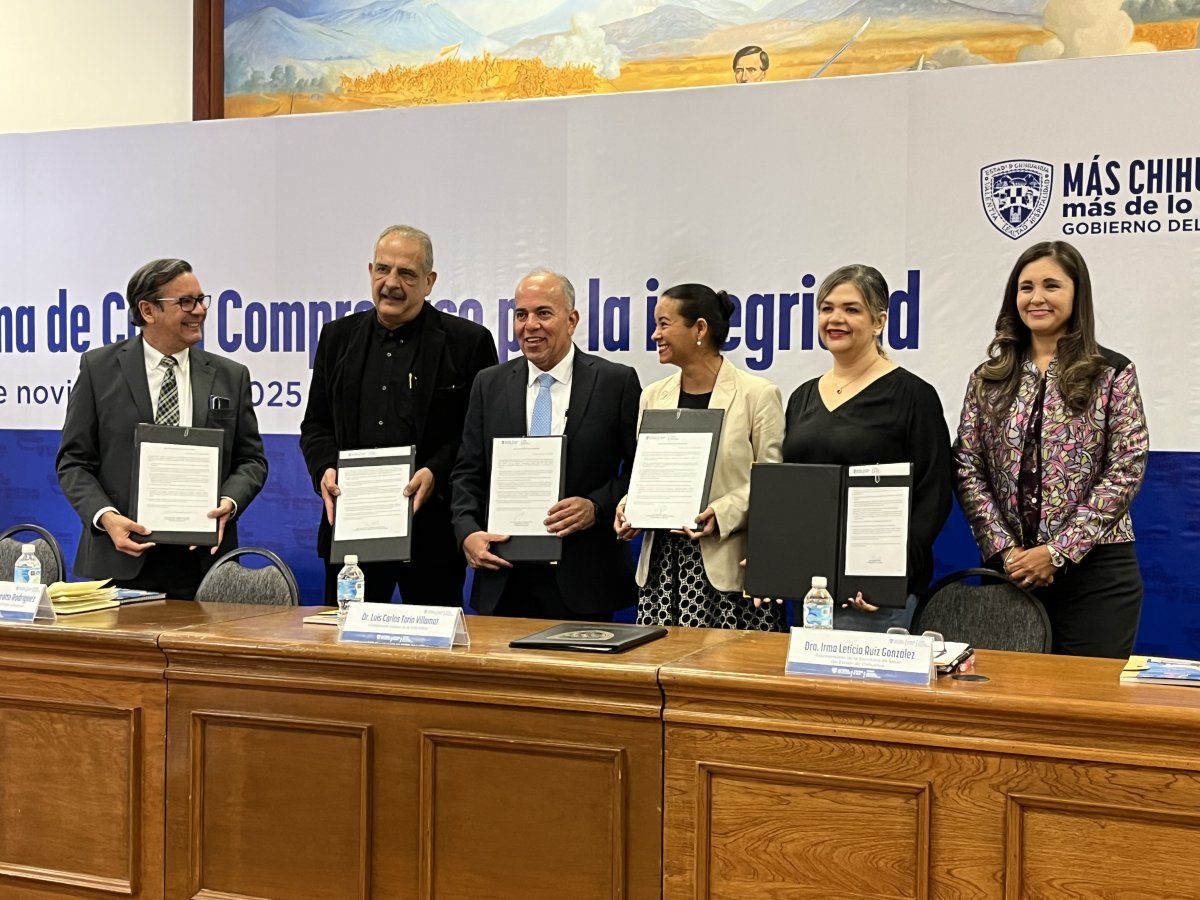El comisionado de la Comisión Estatal para la Protección contra Riesgos Sanitarios (Coespris), Luis Carlos Tarín, a comparado del presidente de la Cámara Nacional del Comercio (Canaco) en Chihuahua, Alejandro Lazzarotto, firmaron un Carta Compromiso por la integridad con el propósito de contar con una Comisión Estatal transparente, cercana a la sociedad y comprometida con el combate a la corrupción.