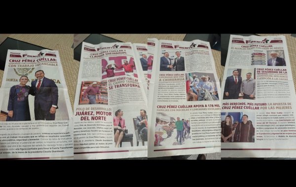 En el contenido de estos folletos que se distribuyen en la capital del Estado, se destacan logros y programas implementados durante su gestión municipal de Cruz Pérez Cuellar en Juárez, así como su trayectoria política, profesional y en el servicio público.