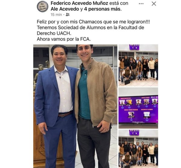 A través de redes sociales se cuestiona la operación e intervención que pudo haber ejecutado el subsecretario de Planeación y Administración en la Secretaría y Educación,  Federico Acevedo Muñoz,  al adjudicarse la victoria de Fernando Mejía en la sociedad de alumnos de Derecho de la UACh y anunciar que ahora van por la de Contaduría y Administración.
