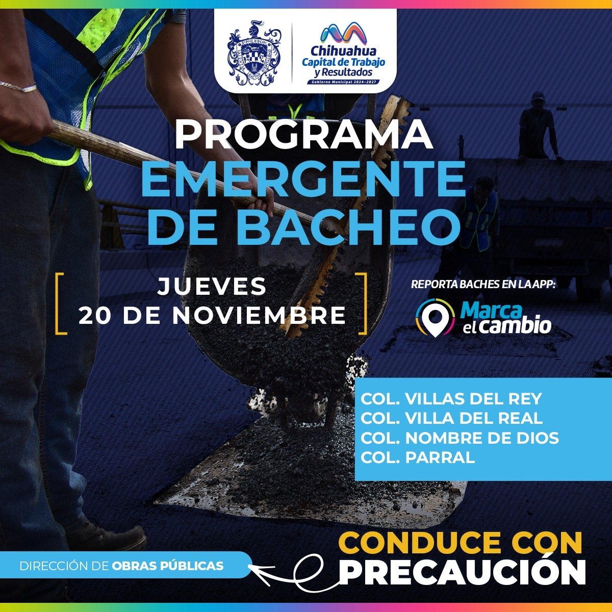 El Gobierno Municipal, a través de la Dirección de Obras Públicas, realizará trabajos de bacheo este jueves 20 de noviembre, mediante el programa emergente en calles de las colonias: Villas del Rey, Villa del Real, Nombre de Dios y Parral.