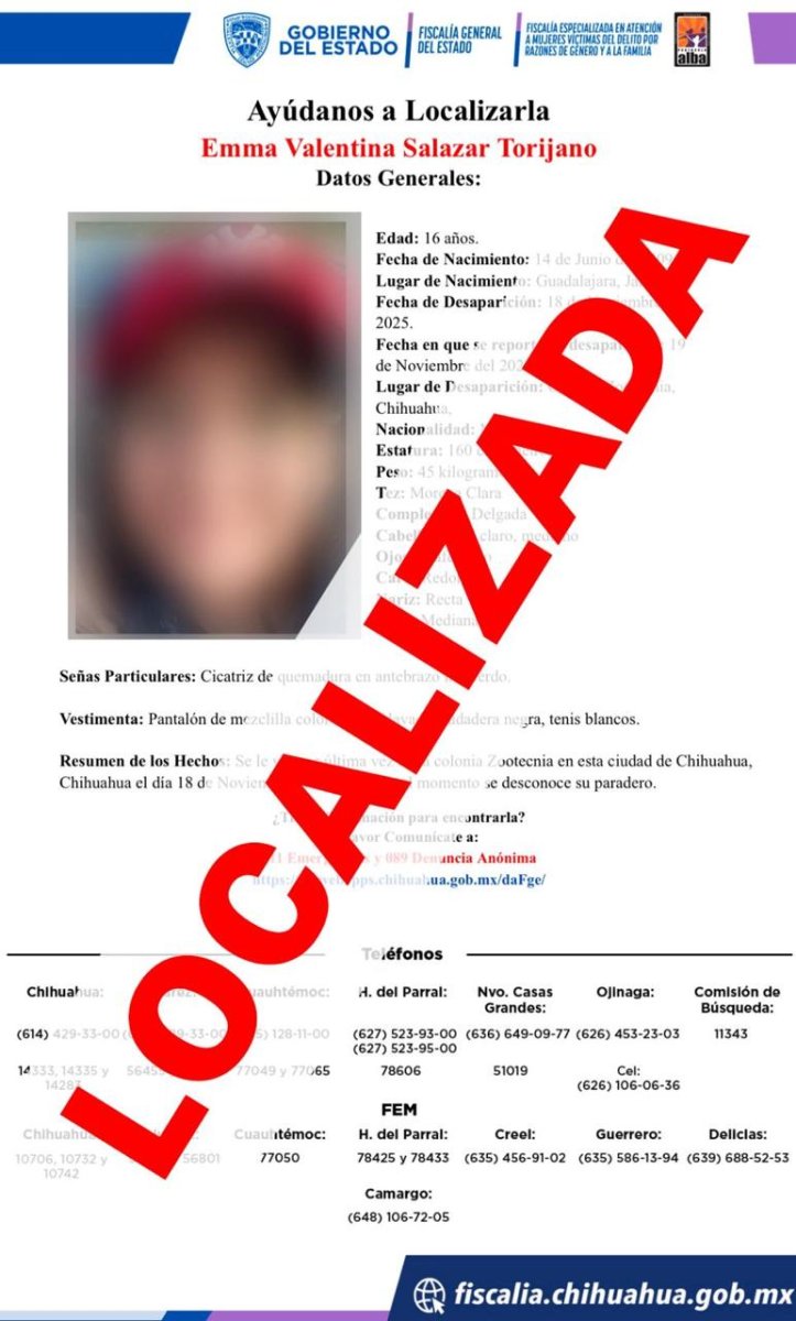 La menor de 16 años de edad fue reportada ante esta fiscalía luego de haber sido vista por última ocasión el 18 de noviembre en la colonia Zootecnia en la ciudad de Chihuahua.