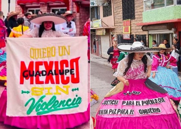 “Si o hay justicia para el pueblo, que no haya paz para el gobierno” fue la frase que adorna el vestido de una de las participantes, mientras que otra joven portó una lona que citó “Quiero un México sin violencia”, “quiero un Guadalupe sin violencia”.