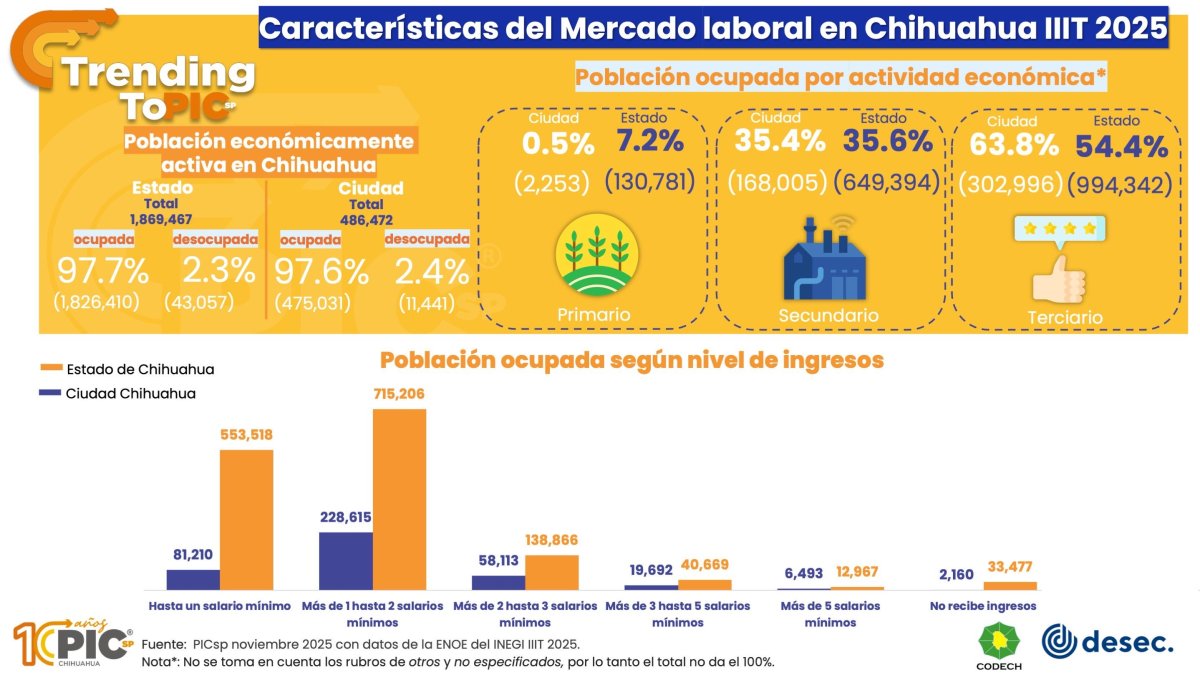 Por parte de la Encuesta Nacional de Ocupación y Empleo (ENOE), se informó que Chihuahua ocupa el segundo lugar con menos informalidad es decir con un 26 por ciento, solamente siendo rebasado por Saltillo con un 25.2 por ciento y el tercer lugar le corresponde a Juárez con un 30.1 por ciento.