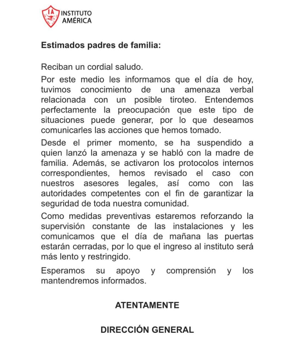 Padres de familia del Instituto América se mantienen en alerta luego de que se diera a conocer una presunta amenaza de tiroteo atribuida a un alumno de nivel secundaria.