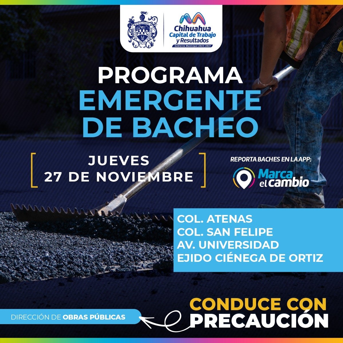 El Gobierno Municipal, a través de la Dirección de Obras Públicas, realizará trabajos de bacheo este jueves 27 de noviembre, mediante el programa emergente en calles de las colonias: Atenas y San Felipe, así como en la avenida Universidad y en el Ejido Ciénega de Ortiz.