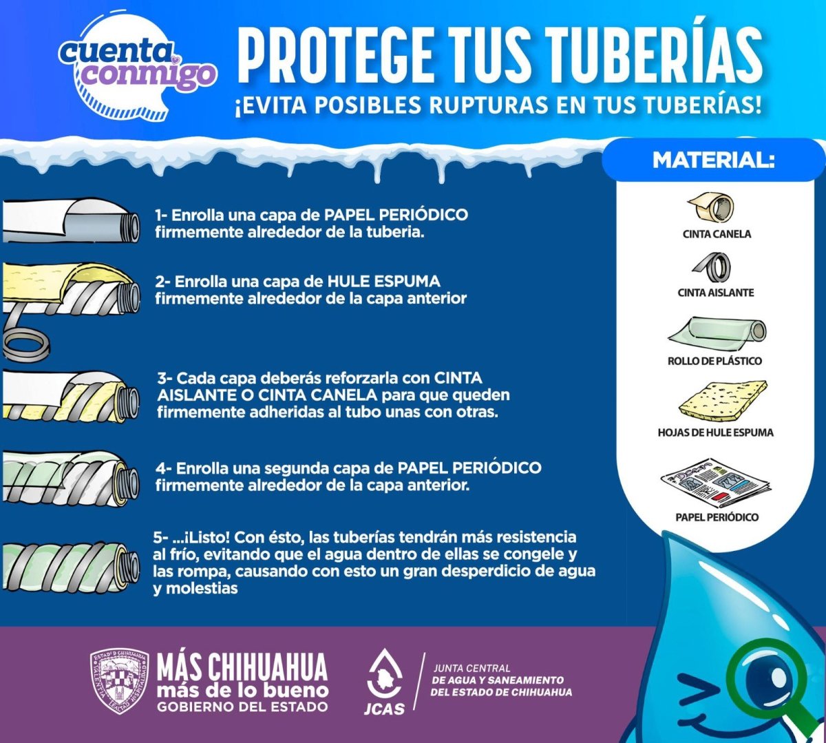 La Junta Central de Agua y Saneamiento (JCAS) invitó a la población a tomar medidas preventivas para reducir el riesgo de congelamiento y rotura de tuberías durante esta temporada. La dependencia recomendó revisar el estado de las instalaciones y reparar cualquier fuga, ya que los escapes de agua suelen convertirse en puntos vulnerables.