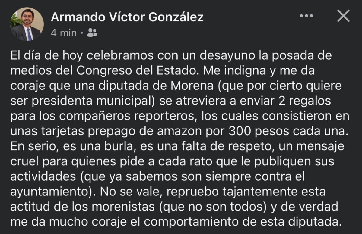 “El día de hoy celebramos con un desayuno la posada de medios del Congreso del Estado. Me indigna y me da coraje que una diputada de Morena (que por cierto quiere ser presidenta municipal) se atreviera a enviar 2 regalos para los compañeros reporteros, los cuales consistieron en unas tarjetas prepago de amazon por 300 pesos cada una. En serio, es una burla, es una falta de respeto, un mensaje cruel para quienes pide a cada rato que le publiquen sus actividades (que ya sabemos son siempre contra el ayuntamiento). No se vale, repruebo tajantemente esta actitud de los morenistas (que no son todos) y de verdad me da mucho coraje el comportamiento de esta diputada”, expresó un personaje respetado por los comunicadores.