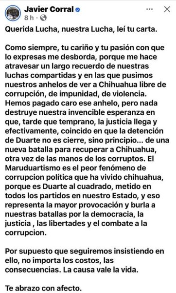 Corral aseguró que la reciente detención de Duarte no constituye el cierre de un capítulo, sino “el principio de una nueva batalla para recuperar a Chihuahua, otra vez de las manos de los corruptos”. En este contexto, señaló que el fenómeno que denomina “Maruduartismo” representa “la mayor provocación y burla” a las luchas por la democracia y contra la corrupción emprendidas en los últimos años.