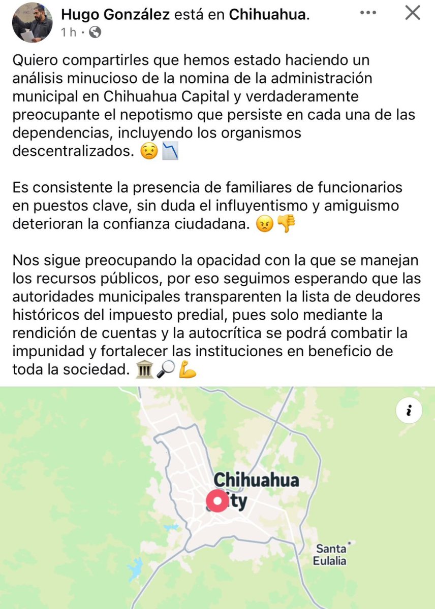 El regidor de Morena, Hugo González, denunció a través de sus redes sociales la persistencia de nepotismo en la administración municipal de Chihuahua Capital, tras un análisis de la nómina que incluyó dependencias y organismos descentralizados.