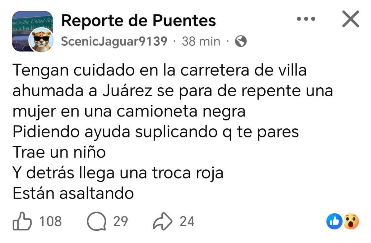 A través de redes sociales, en un grupo dedicado al reporte de puentes y carreteras de Ciudad Juárez, ha comenzado a circular una versión que alerta sobre presuntos asaltos en el tramo carretero de Villa Ahumada a Ciudad Juárez, así como en la vía de Villa Ahumada hacia la ciudad de Chihuahua.