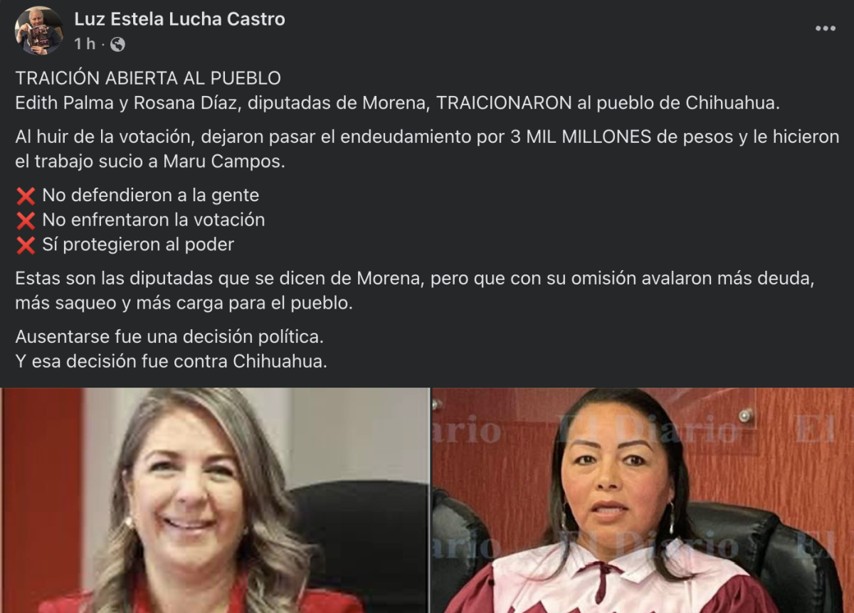 La activista y exconsejera de la Judicatura del Estado de Chihuahua, Luz Estela Lucha Castro, lanzó una dura acusación pública contra las diputadas locales de Morena Edith Palma y Rosana Díaz, a quienes señaló de haber “traicionado al pueblo de Chihuahua” tras ausentarse de una votación en el Congreso del Estado que permitió la aprobación de un endeudamiento por 3 mil millones de pesos.