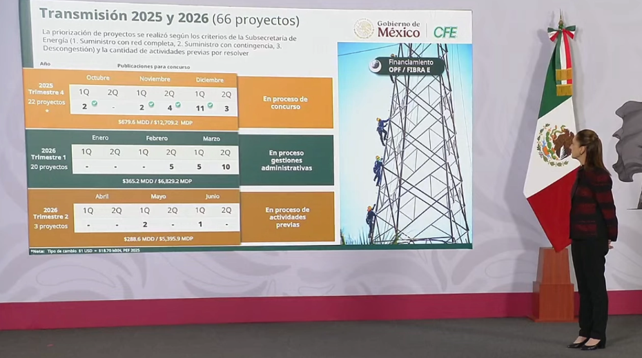 En el rubro de transmisión, la CFE ejecutará 66 proyectos prioritarios entre 2025 y 2026 para eliminar cuellos de botella, reforzar la red y acompañar el crecimiento industrial y urbano del país. De estos, 22 proyectos se concursarán en el último trimestre de 2025 y 44 más a lo largo de 2026, con calendarios definidos y seguimiento puntual.