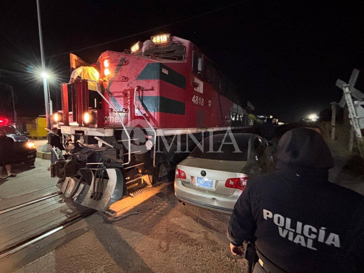 Un automóvil Volkswagen Jetta fue embestido por el tren la noche de este martes, luego de que la conductora intentara cruzar las vías sin respetar el paso del ferrocarril.