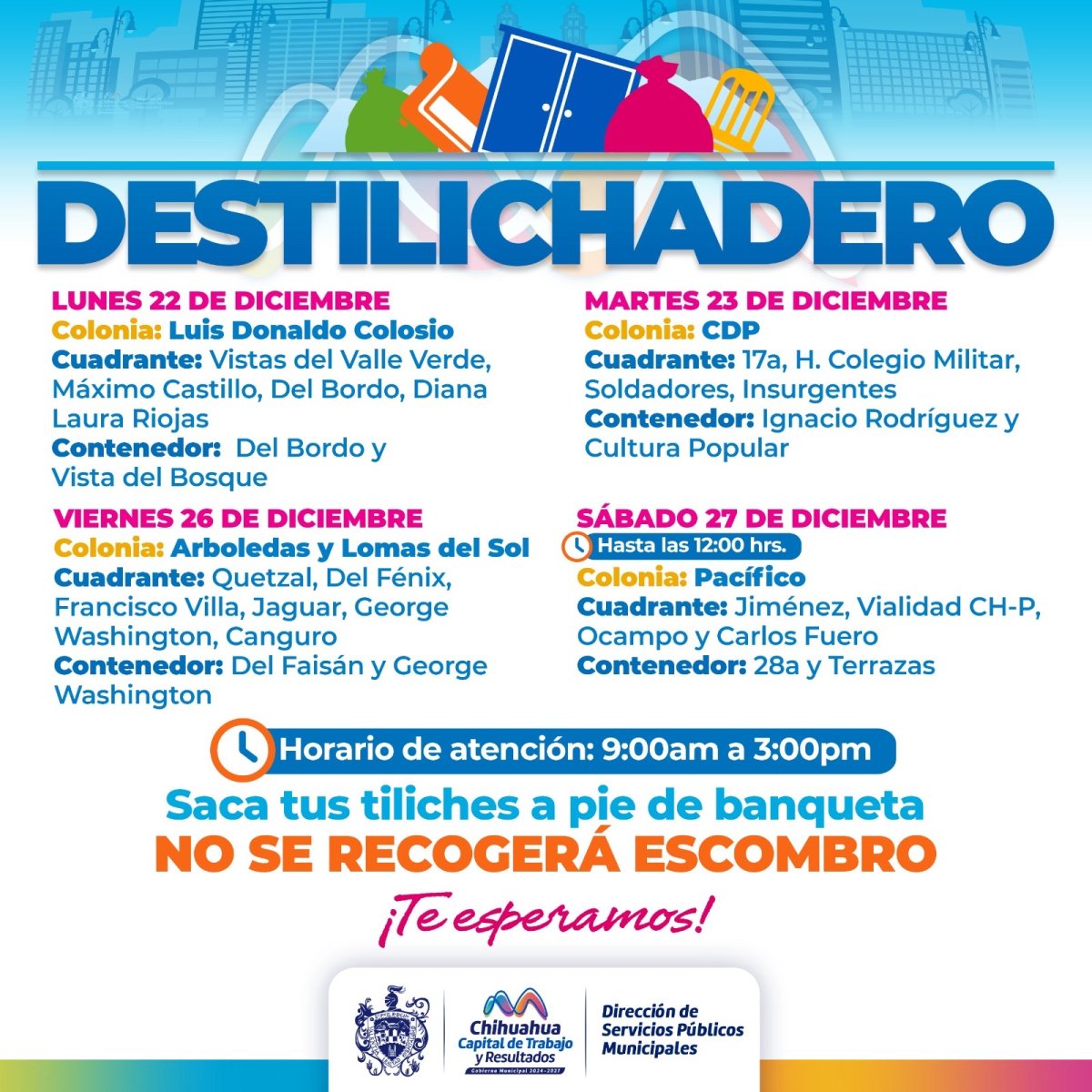 Para evitar acumulaciones de basura de grandes dimensiones en las viviendas, que podría generar plagas o problemas de salud, el Gobierno Municipal, a través de la Dirección de Servicios Públicos Municipales, informa el calendario del programa Destilichadero, que se realizará en siete colonias de la capital del 15 al 20 de diciembre.