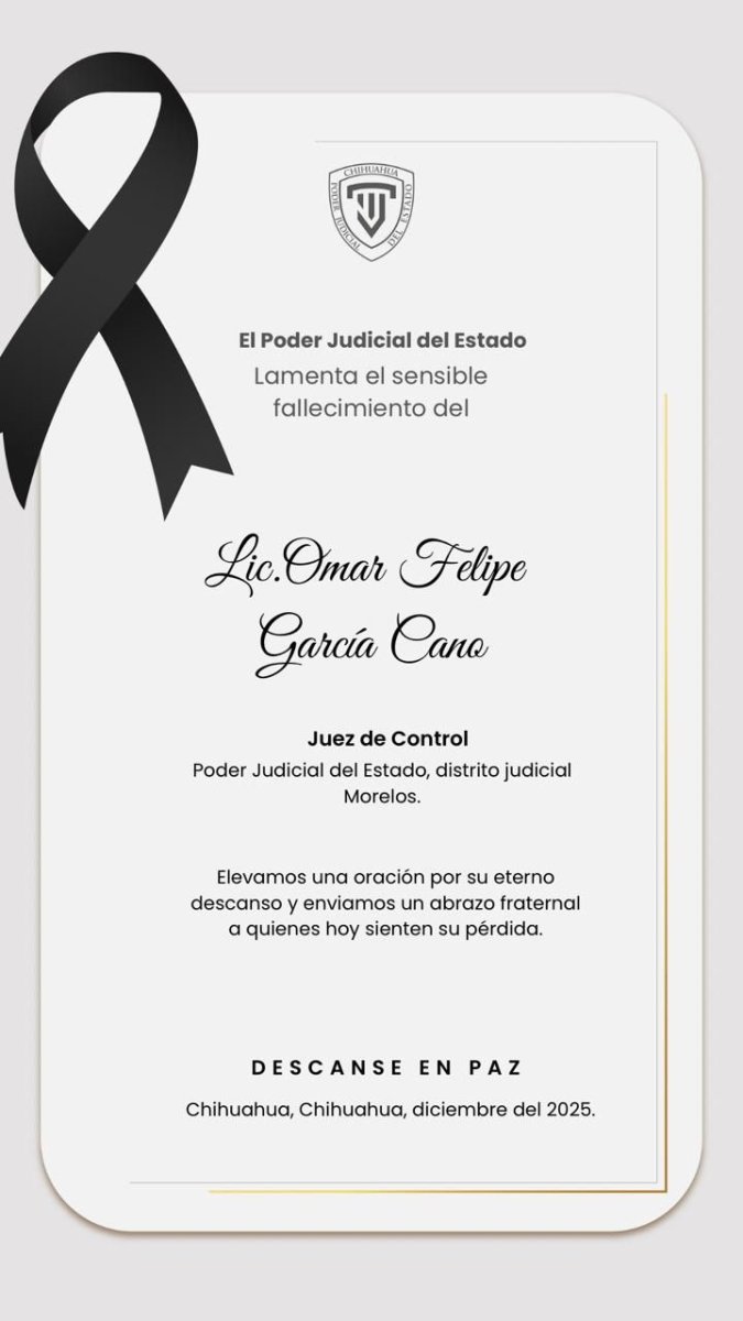 El Poder Judicial del Estado de Chihuahua lamenta profundamente el sensible fallecimiento de nuestro compañero, el Juez de Control Omar Felipe García Cano, adscrito al Distrito Judicial Morelos