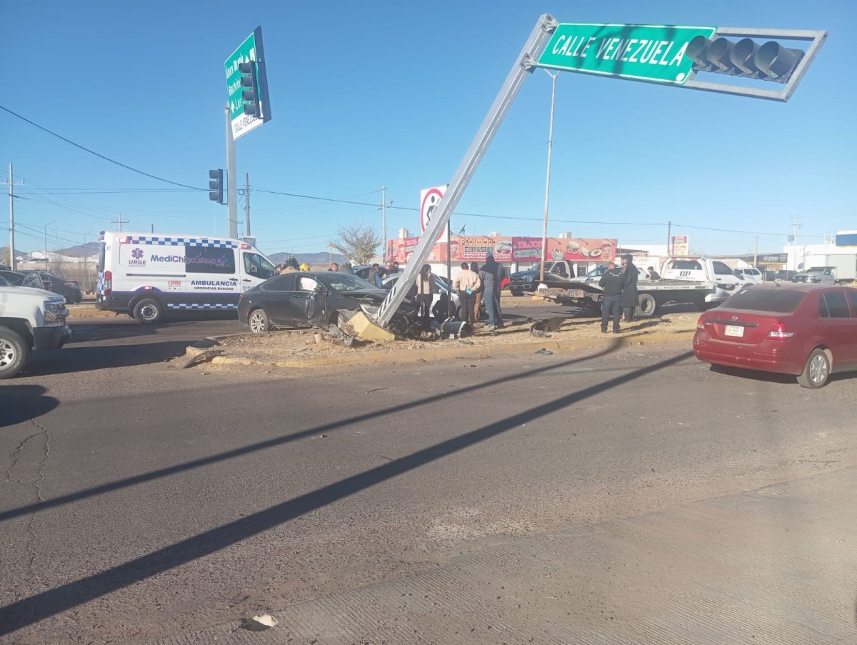 De acuerdo con la información proporcionada por la corporación, el accidente ocurrió cuando uno de los vehículos que circulaba sobre la avenida Tecnológico realizó una maniobra de vuelta a la izquierda, impactando a otra unidad que transitaba en sentido contrario. A consecuencia del choque, uno de los automóviles fue proyectado contra la estructura metálica de un semáforo, propiedad de la Presidencia Municipal, la cual resultó ladeada de su posición original.