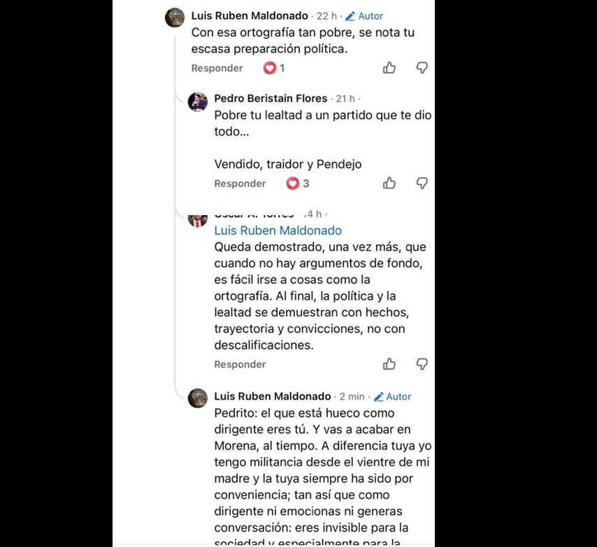 En redes sociales, el dirigente municipal del PRI, Pedro Beristaín y el también priista y ex titular de comunicación del extinto Poder Judicial, Luís Rubén Maldonado, se liaron a insultos.