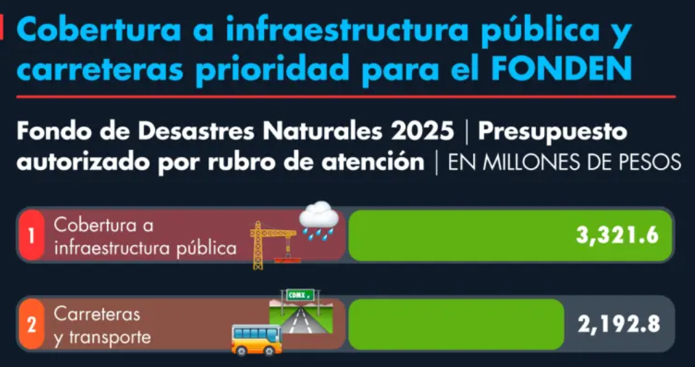 El Fondo de Desastres Naturales (Fonden) 2025 prioriza la reconstrucción de infraestructura pública y carreteras, que en conjunto absorben más de la mitad del presupuesto autorizado, según cifras oficiales.