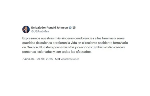A través de su cuenta en X, Ronald Johnson comentó "Expresamos nuestras más sinceras condolencias a las familias y seres queridos de quienes perdieron la vida en el reciente accidente ferroviario en Oaxaca. Nuestros pensamientos y oraciones también están con las personas lesionadas y con todos los afectados".