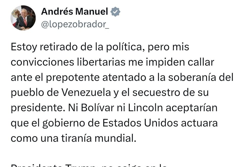 Estoy retirado de la política, pero mis convicciones libertarias me impiden callar ante el prepotente atentado a la soberanía del pueblo de Venezuela y el secuestro de su presidente. Ni Bolívar ni Lincoln aceptarían que el gobierno de Estados Unidos actuara como una tiranía mundial.