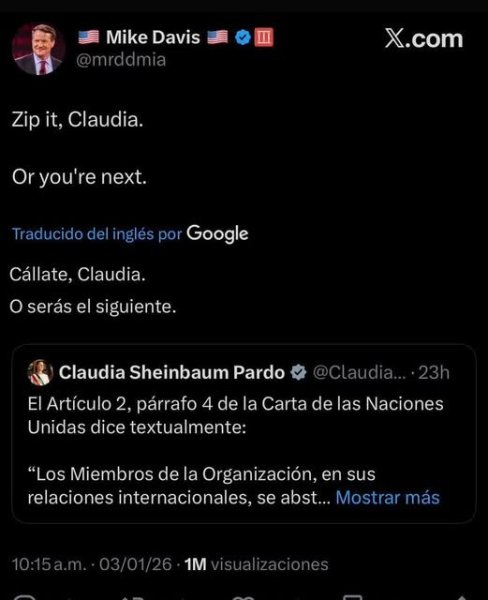 Muchos lo interpretan como una advertencia amenazante, en el contexto de las tensiones entre la administración Trump y México por temas como cárteles, migración y la reciente operación en Venezuela.