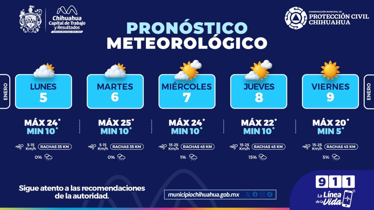 La Coordinación Municipal de Protección Civil informa que, durante la semana del lunes 5 al viernes 9 de enero, se prevén condiciones mayormente nubladas al inicio de la semana, con un descenso gradual en las temperaturas hacia el fin de semana, así como un incremento en la velocidad del viento en la Capital del estado.