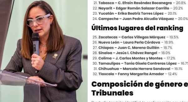 Con una aprobación del 16.1%, la Chihuahuense ocupa el lugar 31 de las 32 entidades federativas de México, solo superando a Fanny Amador de Tlaxcala, lo que deja a Chihuahua en el sótano de la justicia.