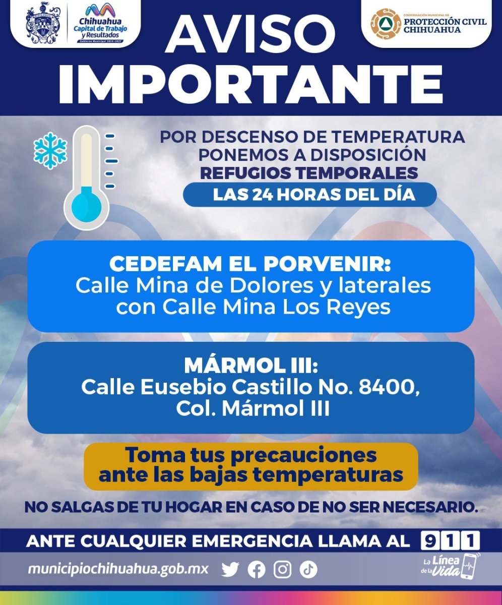 El Gobierno Municipal, a través del DIF y la Coordinación Municipal de Protección Civil, informa que, ante las bajas temperaturas donde pronostican mínimas de hasta -3°C para este fin de semana, del 9 al 11 de enero, se mantendrán habilitados las 24 horas los refugios temporales para resguardar a las personas que lo necesiten.