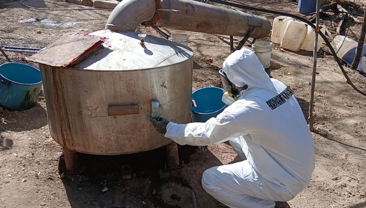 El segundo operativo tuvo lugar en el poblado de Los Cedros, Sinaloa, donde las autoridades desmantelaron otro laboratorio y aseguraron aproximadamente 750 kilos de producto terminado, además de 1,150 litros y 695 kilos de sustancias químicas.