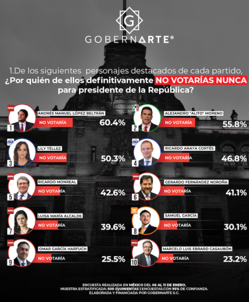 De acuerdo con los resultados de la casa encuestadora en la pregunta “¿Por quién de ellos definitivamente no votarías nunca para presidente de la República?”, el secretario de Morena, obtuvo un 60.4% de rechazo, superando incluso a personajes controversiales como el dirigente nacional del PRI, Alejandro Moreno Cárdenas, que llegó a un 55.8%.