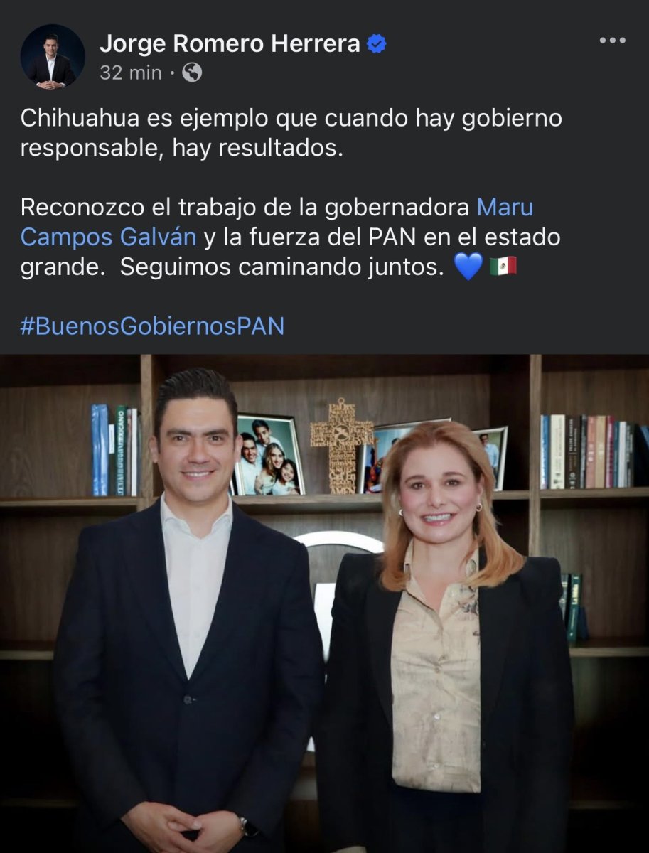 El presidente nacional del PAN Jorge Romero Herrera, reconoció públicamente el trabajo de la gobernadora de Chihuahua, Maru Campos Galván, al señalar que el estado es ejemplo de que cuando hay un gobierno responsable, se obtienen resultados.