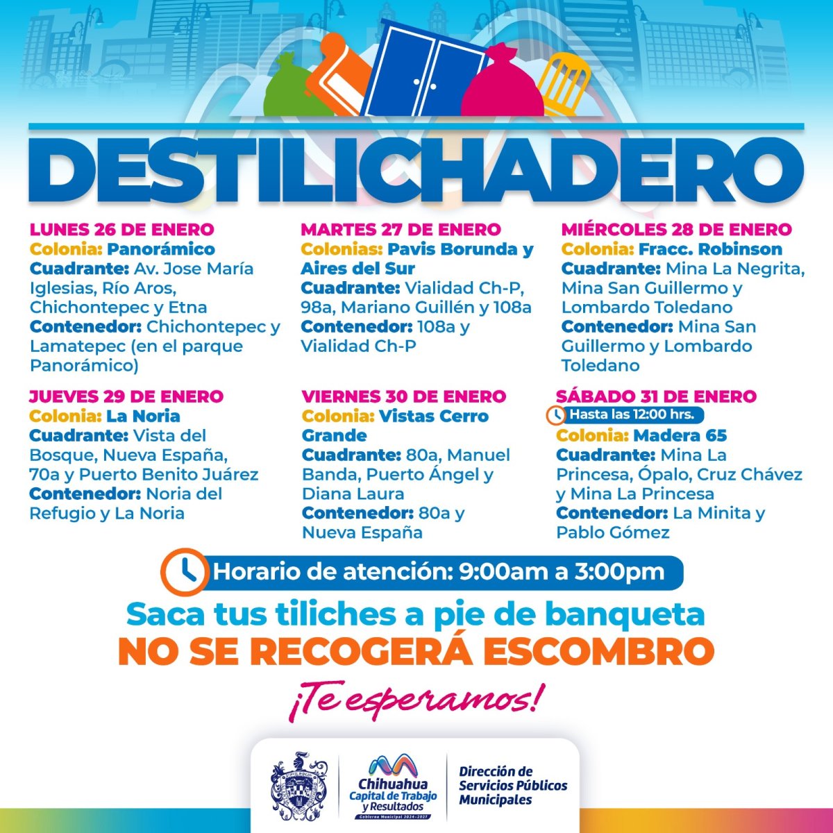 Para evitar acumulaciones de basura de grandes dimensiones en las viviendas, que podría generar plagas o problemas de salud, el Gobierno Municipal, a través de la Dirección de Servicios Públicos Municipales, informa el calendario del programa Destilichadero, que se realizará en siete colonias de la capital del 26 al 31 de enero.