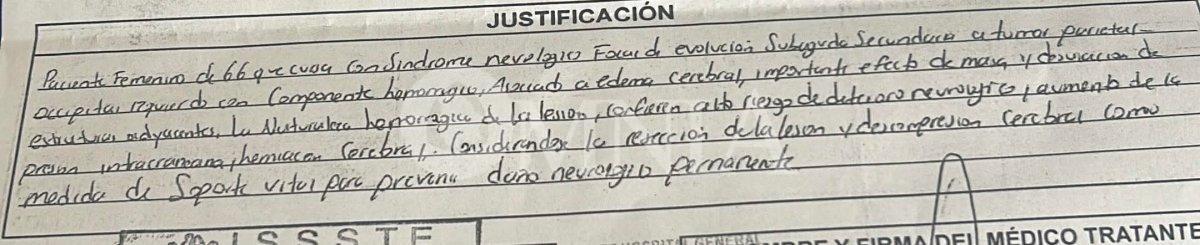 De acuerdo con la denuncia, la paciente presenta un tumor cerebral con edema, una condición que requiere intervención quirúrgica inmediata, ya que cada día sin atención incrementa el riesgo de daño neurológico irreversible, secuelas permanentes o incluso la muerte.