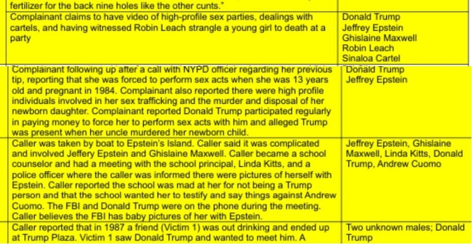 El documento también menciona que Trump abusó de varias mujeres y jóvenes menores de edad, e inclusive podría estar implicado en la muerte de una adolescente, ya que supuestamente presenció su estrangulamiento.
