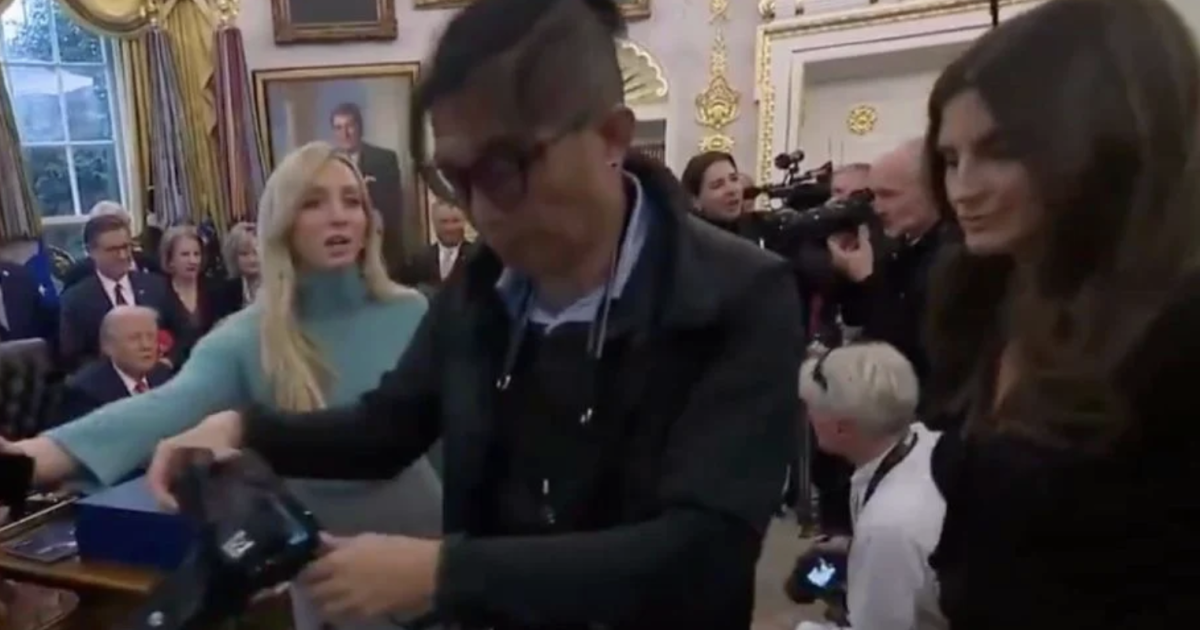 A través de redes sociales, la Casa Blanca difundió un video del momento en que una integrante del staff retira a la periodista y a su fotógrafo de la oficina durante una conferencia de prensa.