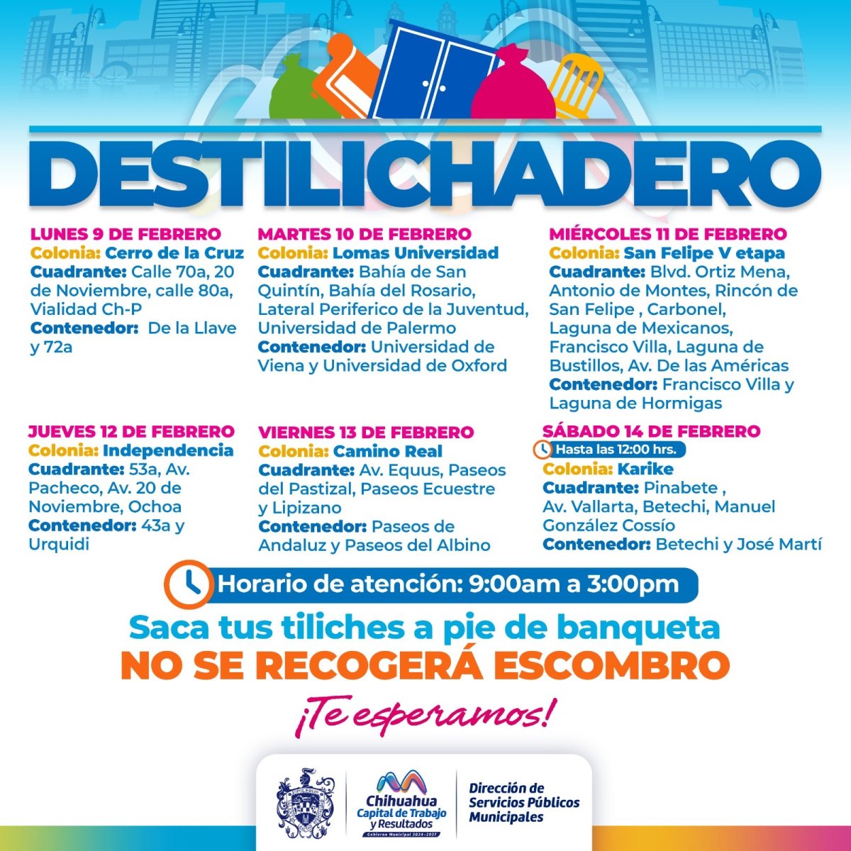 Para evitar acumulaciones de basura de grandes dimensiones en las viviendas, que podría generar plagas o problemas de salud, el Gobierno Municipal, a través de la Dirección de Servicios Públicos Municipales, informa el calendario del programa Destilichadero, que se realizará en seis colonias de la capital del 9 al 14 de febrero.
