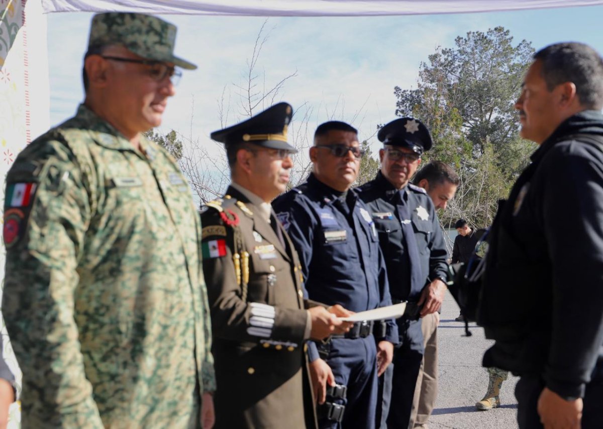 Autoridades de Sedena, Guardia Nacional, Fiscalía General del Estado, Dirección de Seguridad Pública Municipal y la Secretaría de Seguridad Pública Estatal, encabezaron la entrega de reconocimientos a quienes los representan en los trabajos operativos en las Bases de Operación Interinstitucional, conocidas como células B.O.I., fueron un total de 36 elementos conmemorados por su incansable labor en beneficio de mantener y reforzar la seguridad para las familias chihuahuenses.