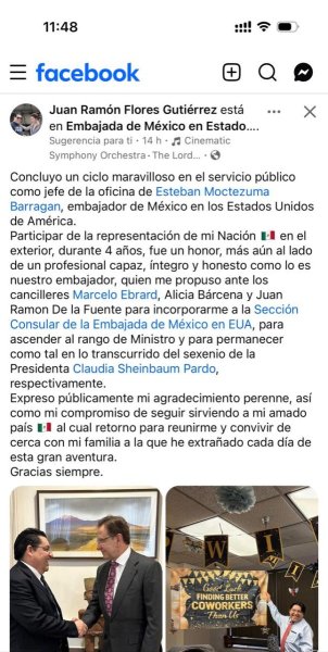 Juan Ramón Flores Gutiérrez anunció la conclusión de su ciclo en el servicio público como jefe de la oficina del embajador de México en Estados Unidos, Esteban Moctezuma Barragán, tras cuatro años de labor en la representación diplomática.