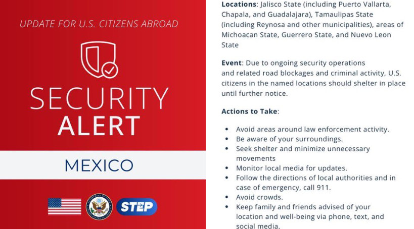 Embajada de EE. UU. emite alerta de emergencia para cinco estados de México tras hechos violentos