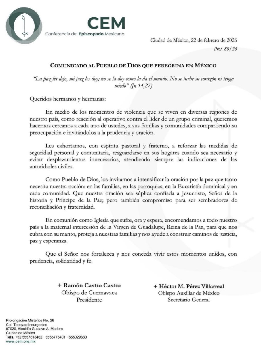 La Conferencia del Episcopado Mexicano (CEM) emitió un comunicado dirigido a la comunidad católica y a la sociedad en general, en el que manifestó su cercanía y solidaridad ante los recientes hechos de violencia registrados en diversas regiones del país, como reacción a un operativo luego de la muerte del líder criminal, Nemesio Oseguera Cervantes “Mencho”.