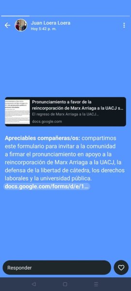 Juan Carlos Loera señala: Apreciables compañeras/os: compartimos este formulario para invitar a la comunidad a firmar el pronunciamiento en apoyo a la reincorporación de Marx Arriaga a la UACJ, la defensa de la libertad de cátedra, los derechos laborales y la universidad pública.