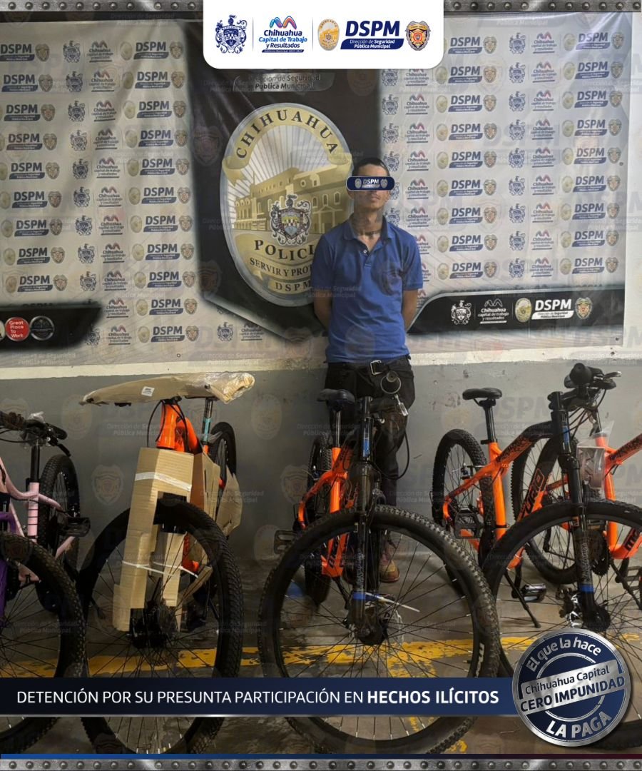 Como resultado de las acciones operativas, los agentes lograron ubicar a un masculino en el cruce de la avenida La Junta y Río Bravo, oculto en una tapia. En el lugar se aseguraron cinco bicicletas, mismas que corresponden al robo previamente reportado.
