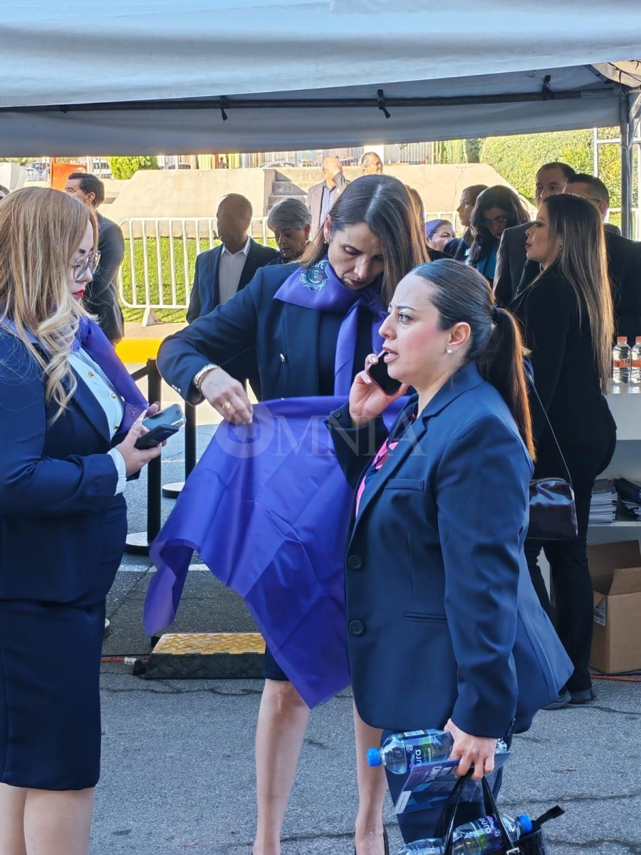 Los pañuelos morados, por cierto un color relacionado al día internacional de la mujer, acompañados de un notable escudo de la secretaria, se vieron entre las mujeres que trabajan para la agencia, esto destacandolas del resto de los asistentes.