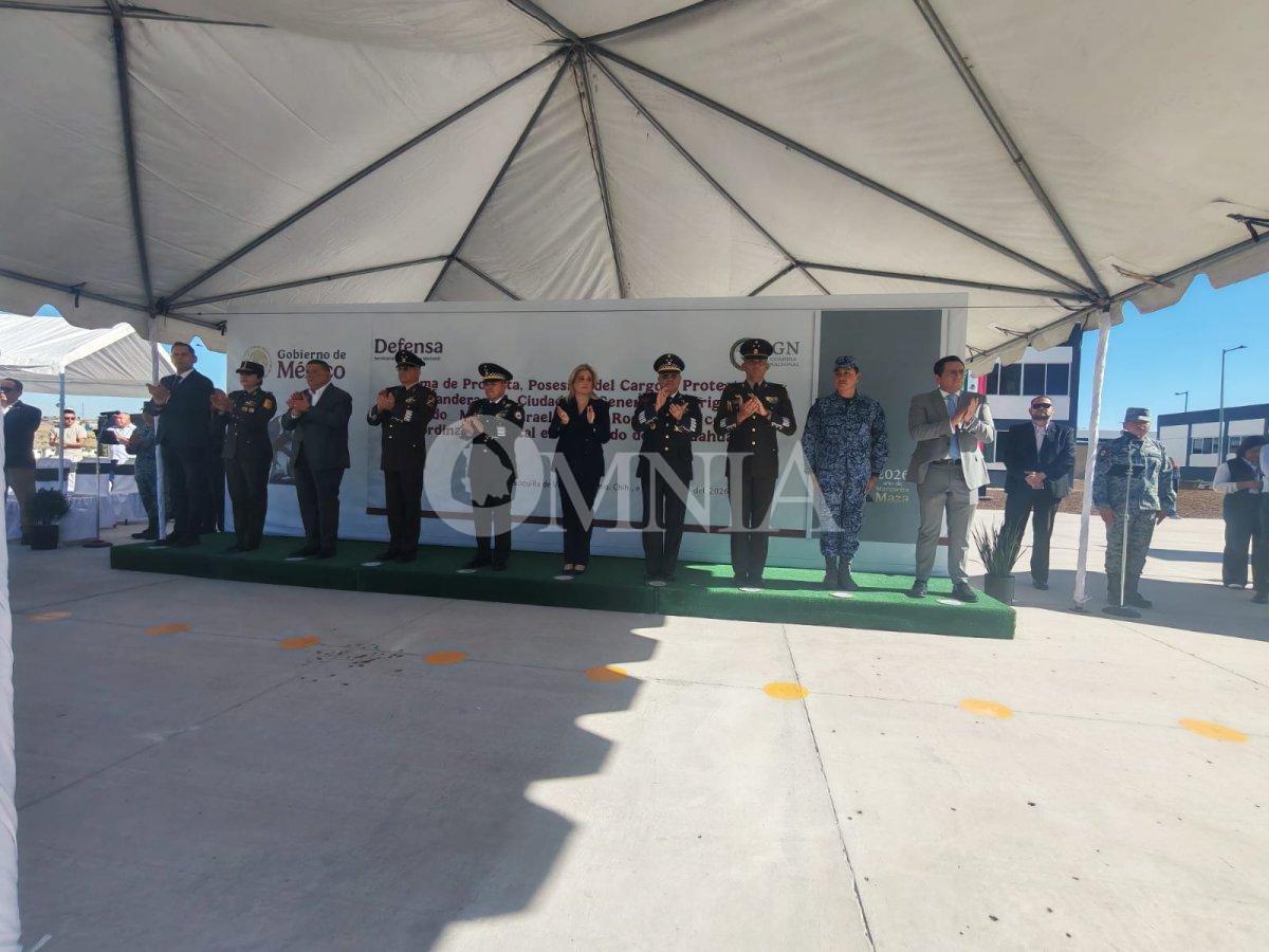 La gobernadora María Eugenia Campos Galván participó en la toma de protesta del general de Brigada de la Guardia Nacional, Israel Caro Rodríguez, evento que se llevó a cabo en las instalaciones de la GN.