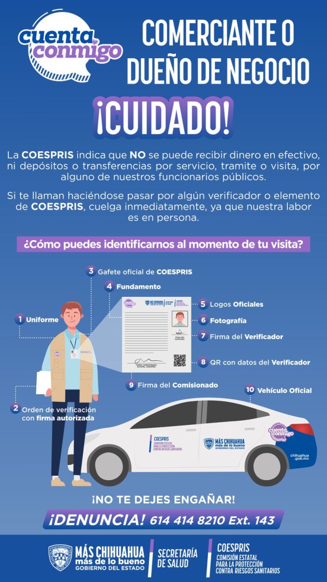 Todo personal autorizado de Coespris debe contar con un vehículo oficial rotulado, gafete oficial vigente, uniforme institucional y una orden de verificación debidamente fundamentada y por escrito.