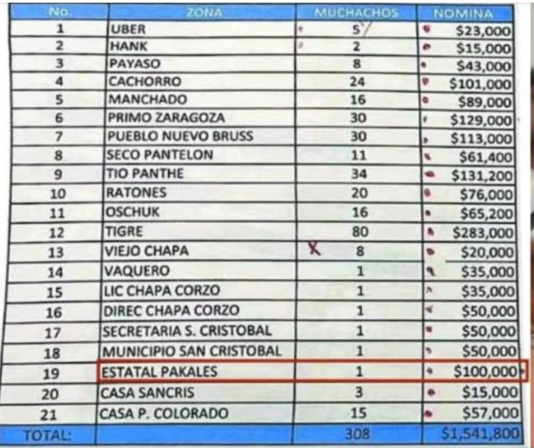 En la imagen difundida en medios nacionales y redes sociales, se observa el apartado “Estatal Pakales”, junto a la cantidad de 100 mil pesos, lo que desembocó la controversia tanto a nivel nacional, como local. Aunque no se ha confirmado que Aparicio esté involucrado, lo importante es que esta agencia fue instaurada para combatir el crimen organizado, lo que deja muy mal parado al gobierno chiapaneco, y al titular de la dependencia.