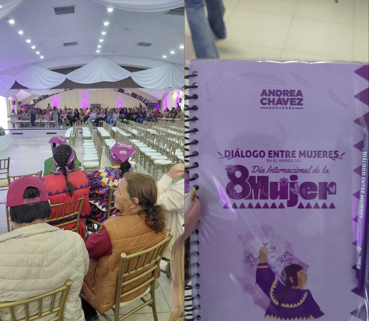 Durante un evento por el Día Internacional de la Mujer realizado en el Club de Leones, se vieron a mujeres indígenas añadiendo a su usanza pañuelos morados con la leyenda de la senadora Andrea Chávez Treviño y libretas con su nombre.