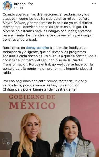A través de redes sociales, la legisladora afirmó que en Morena se debe priorizar la unidad y el trabajo por la ciudadanía y reconoció la labor de Chávez al llevar programas sociales a distintas regiones de Chihuahua y reiteró que seguirán trabajando por el bienestar de la población. No podía faltar ese ingrediente.