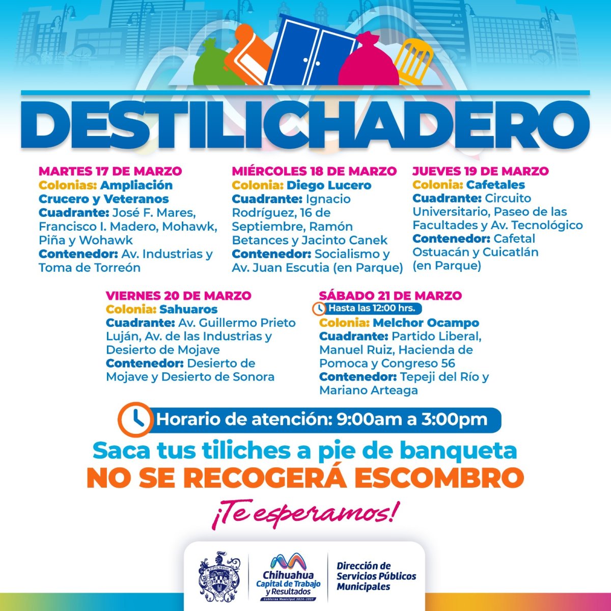Para evitar acumulaciones de basura de grandes dimensiones en las viviendas, que podría generar plagas o problemas de salud, el Gobierno Municipal, a través de la Dirección de Servicios Públicos Municipales, informa el calendario del programa Destilichadero, que se realizará en seis colonias de la capital del 17 al 21 de marzo.