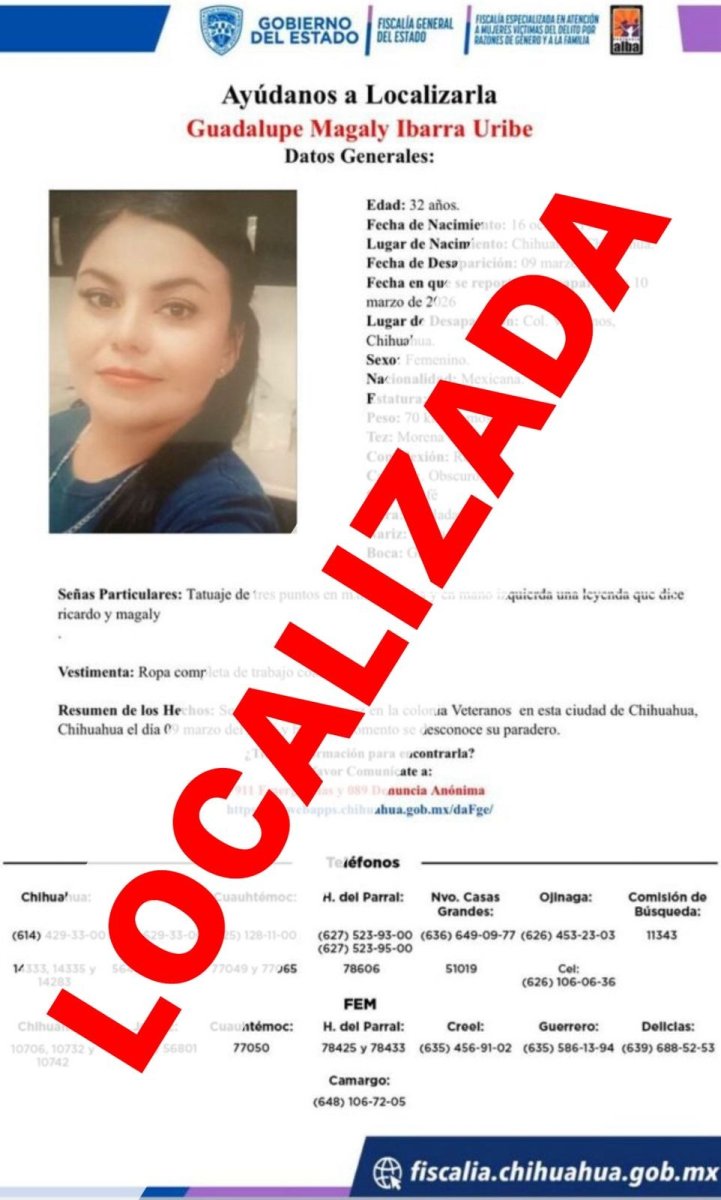 Elementos de la Agencia Estatal de Investigación adscritos a la Fiscalía Especializada en Atención a Mujeres Víctimas del Delito por Razones de Género y de la Familia Zona Noroeste, localizaron sana y salva a Guadalupe Magaly I. U., de 32 años de edad, quien contaba con reporte de desaparición interpuesto del 09 de marzo de 2026, en la ciudad de Chihuahua.